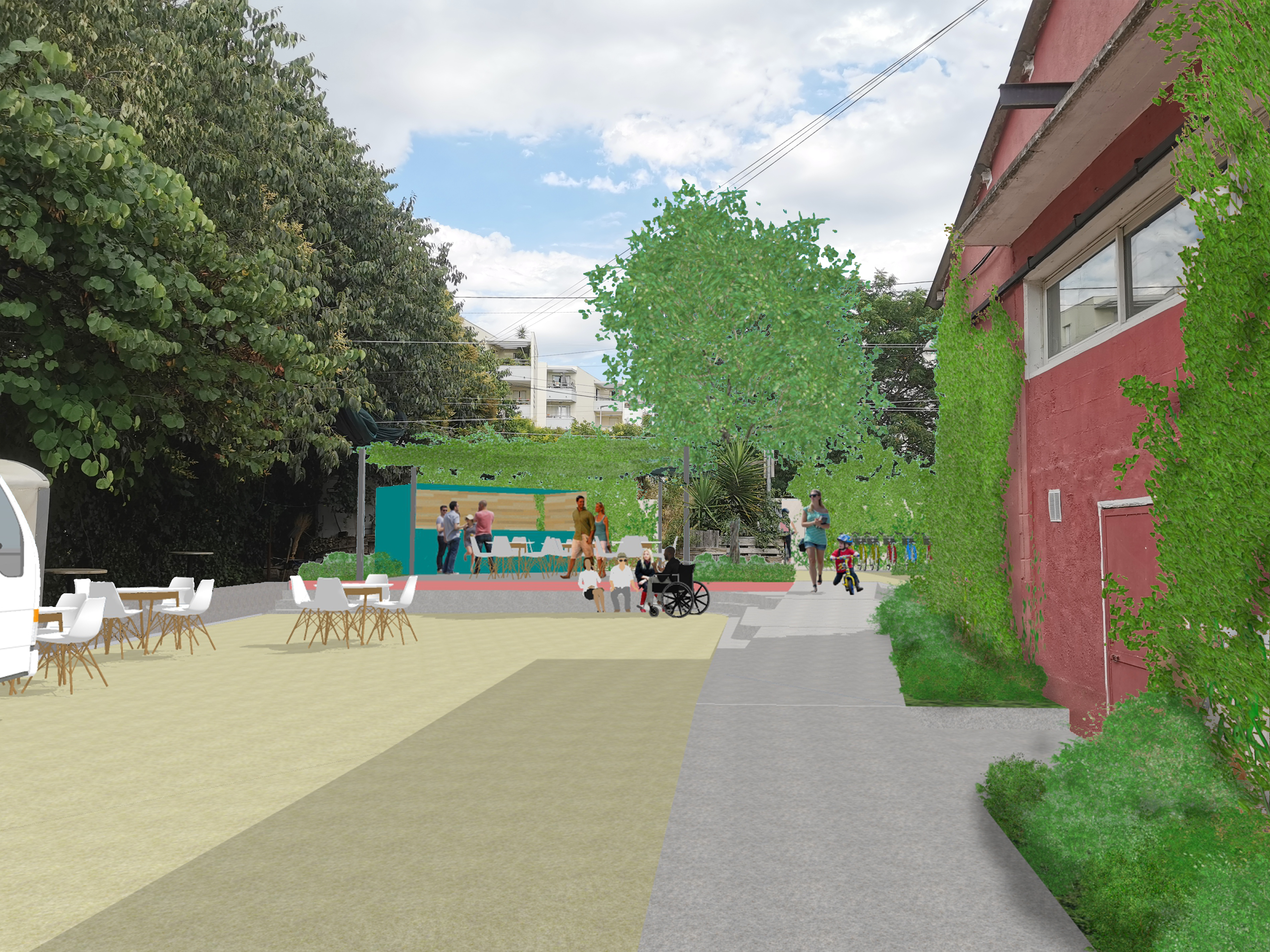 - Créer un sentiment de bienvenue pour valoriser l’axe traversant et les espaces mis à disposition du public. Permettre la rencontre autour d’un verre, d’un pique-nique. Prendre soin des lieux.