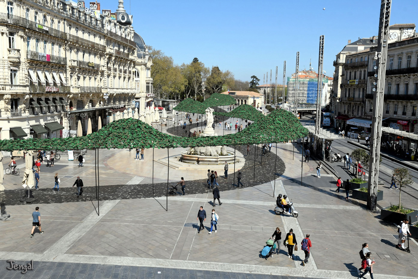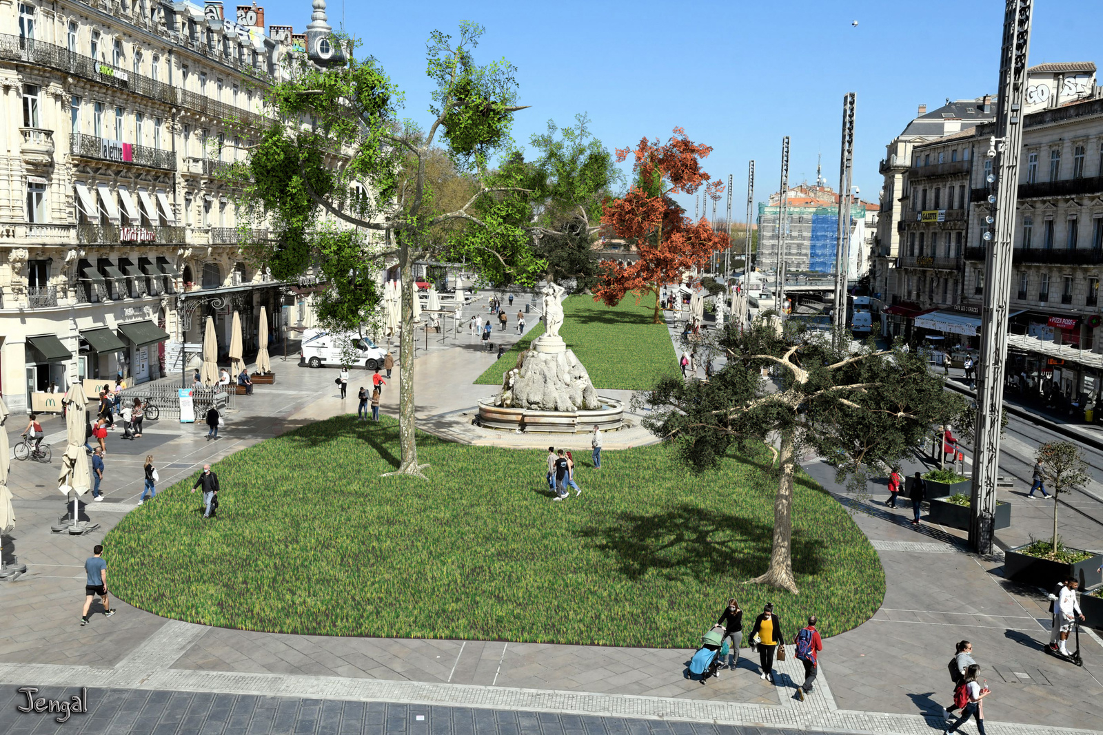 Il faut amener de la fraîcheur à la place la plus iconique de Montpellier. Il faut donc rajouter des arbres adaptés au climat méditerranéen, et prodiguant une ombre rafraichissante : tilleuls, platanes, micocouliers, des arbres à feuilles caduques qui changent avec les saisons, laissent la place ensoleillée en hiver, et la rendent ombragée en été. À cause du parking de la Comédie, il faudrait les mettre dans des jardinières surélevées, dont les cotés pourraient servir de bancs, tout autour de la place. Un couloir central subsisterait, pour garder la vue sur l'Opéra, aligné avec les 3 Grâces.