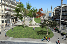Planter des arbres est inadapté, cela sera très cher, et les arbres seront à renouveler sans arrêt. Pourquoi pas des ombrières comme à Nimes, ou un passage le long de la comédie avec des "pergolas" couvertes dont la toiture serait ouverte de terre sur 20 cm, et plantée avec des herbes méditerranéennes aromatiques (thym...) qui embaumeraient la place. Cette allée parfumée permettrait de traverser à l'ombre en été, et laisserait libre le reste de la place. Il faudrait aussi des toilettes à proximité , et des zones de circulation pour les vélos, trottinettes ...