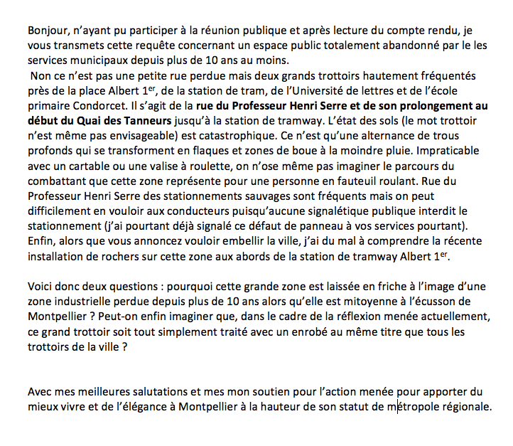 Dans le document concernant le quartier Beaux Arts- Boutonnet, il n'est fait état d'aucun projet pour l'avenue du professeur Grasset. Bien qu'elle soit large, il n'y a aucune place pour les piétons, qui doivent jongler en permanence entre les trams, les voiture, les vélos, les trottinettes électriques... C'est désagréable, stressant... et parfois dangereux.