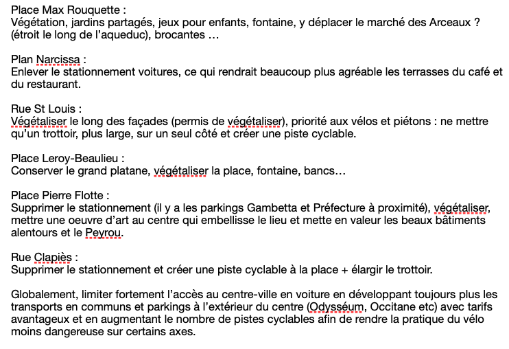 Globalement, limiter fortement l’accès au centre-ville en voiture en développant toujours plus les transports en communs et parkings à l’extérieur du centre (Odysséum, Occitane etc) avec tarifs avantageux et en augmentant le nombre de pistes cyclables afin de rendre la pratique du vélo moins dangereuse sur certains axes.