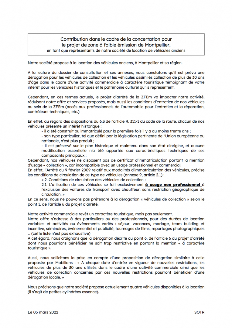 Vous trouverez ci-joint notre contribution dans le cadre de la concertation pour le projet de zone à faible émission de Montpellier, en tant que représentants de notre société de location de véhicules anciens.