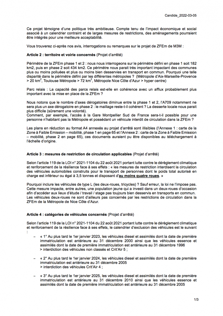 Nous transmettons en pièce jointe nos avis, interrogations ou remarques sur le projet de ZFEm de Montpellier.